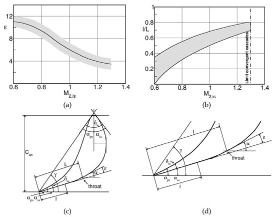Recommended values of (a) and (b) for the design of the blade rear suction side for increasing outlet Mach numbers. Full (c) and close-up (d) view of the parameters characterizing the turbine geometry.