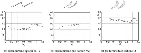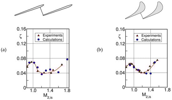Example of profile loss prediction for transonic turbine cascade, adapted from [9]; (a) low pressure steam turbine tip section, (b) high pressure gas turbine guide vane.