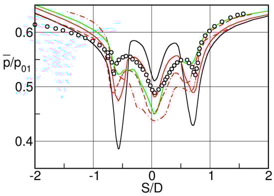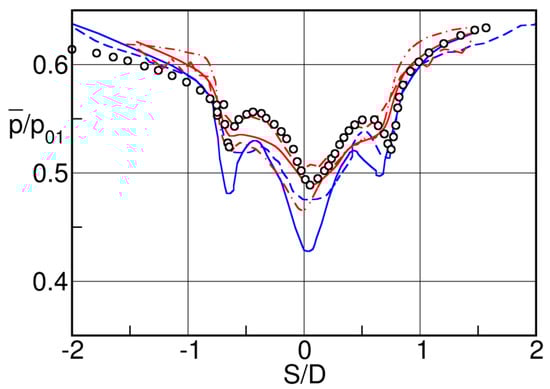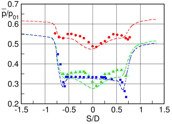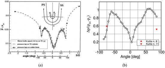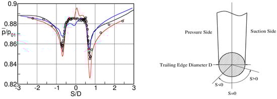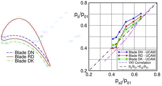 To illustrate this, Figure 8 presents the base pressure data of Xu and Denton [15] for three of a family of four very highly loaded gas turbine rotor blades with a blade turning angle of and a pitch-to-chord , tested with three different trailing edge thicknesses. The blades are referred to as blade RD, for the datum blade, and blades DN and DK for changes of 0.5 and 1.5 times the trailing edge thickness with respect to the datum case.