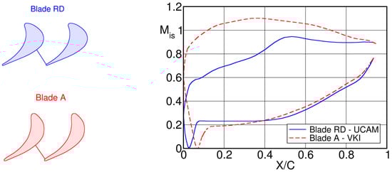 Comparison of blade Mach number distribution for blade RD of Xu and Denton [15], (solid curve, ) with VKI blade (dashed curve, ).