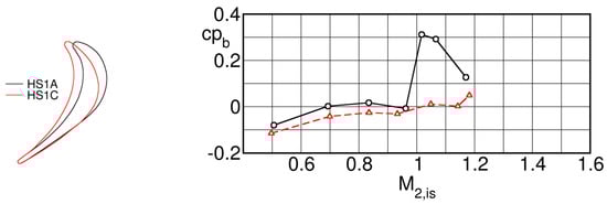 The possible effect of boundary layer separation resulting from high rear suction side diffusion resulting in high base pressures was also mentioned by Corriveau and Sjolander in 2004 [20], comparing their nominal mid-loaded rotor blade HS1A, mentioned already before, with an aft- loaded blade HS1C with an increase of the suction side unguided turning angle from 11.5° to 14.5°. It appears that the increased turning angle could cause, in the transonic range, shock induced boundary layer transition near the trailing edge with, as consequence, a sharp increase of the base pressure, i.e., a sudden drop in the base pressure coefficient as seen in Figure 10. Note that the reported in the figure has been converted to of the original data.
