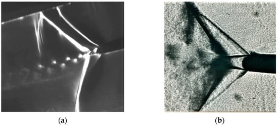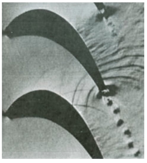 Lawaczeck and Heinemann [24], and Heinemann and Bütefisch [25], were probably the first to perform some systematic schlieren visualizations on transonic flat plate and cascades with different trailing edge thicknesses using a flash light of 20 nano-seconds only, and deriving from the photos the vortex shedding frequencies and Strouhal numbers. The schlieren picture in Figure 11 shows impressively that the shedding of each vortex from the trailing edge generates a pressure wave which travels upstream.