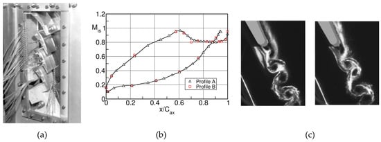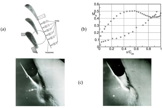 Very large-scale turbine nozzle guide vane (VKI LS-94); case. (a) test section, (b) surface isentropic Mach number distribution, (c) schlieren photographs. Adapted from [32].