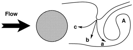 Gerrard [38], describes the vortex formation for the flow behind a cylinder as follows, Figure 15. The growing vortex (A) is fed by the circulation existing in the upstream shear layer until the vortex is strong enough to entrain fluid from the opposite shear layer bearing vorticity of the opposite circulation. When the quantity of entrained fluid is sufficient to cut off the supply of circulation to the growing vortex—the opposite vorticity of the fluid in both shear layers cancel each other—then the vortex is shed off.