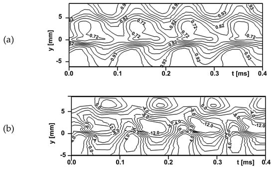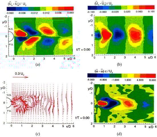 As illustrated by Gerrard [38] (see Figure 15), the vortex formation is driven by the vorticity in the suction and pressure side boundary layers. The vorticity terms and in the wake have been determined taking respectively the curl of the phase averaged and time averaged velocity field: and , Figure 16 (lower right). The local maxima and minima and saddle regions (the points where the vorticity changes its sign) define the location, extension, rotation and intensity of the vortices.