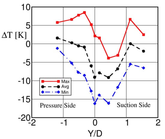 - Carscallen, W.E.; Currie, T.C.; Hogg, S.I.; Gostelow, J.P. Measurement and Computation of Energy Separation in the Vortical Wake Flow of a Turbine Nozzle. ASME J. Turbomach. 1999, 121, 703–708. [Google Scholar] [CrossRef]