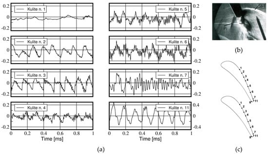 - Ubaldi, M.; Zuni, P.; Campora, U.; Ghiglione, A. Detailed Velocity and Turbulence Measurements of the Profile Boundary Layer in a Large-Scale Turbine Cascade. In Proceedings of the ASME 1996 International Gas Turbine and Aeroengine Congress and Exhibition, Birmingham, UK, 10–13 June 1996. ASME Paper 96-GT-42. [Google Scholar] [CrossRef]
