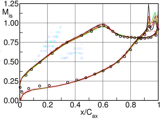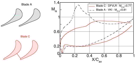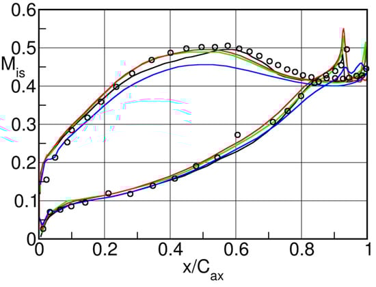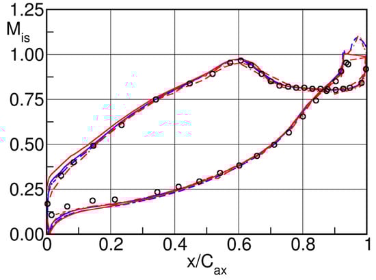 A possible explanation for the large differences is given by comparing the blade Mach number distribution of the datum blade with that of a VKI blade with a taken from [6], see Figure 9. To enable the comparison, the blade Mach number distribution of Xu & Denton (solid line) presented originally in function of the axial chord , had to be replotted in function of . The comparison is done for an isentropic outlet Mach number .