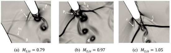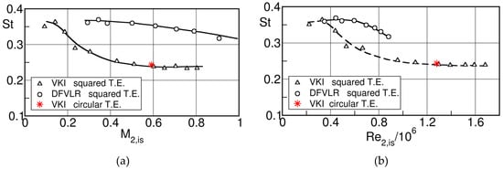 The large-scale turbine guide vane used in these experiments was designed at VKI (Table 2) and released in 1994 [37]. The blade design features a front-loaded blade with an overall low suction side turning in the overhang section and, in particular, a straight rear suction side from halfway downstream of the throat, Figure 14. Due to mass flow restrictions in the VKI blow down facility, the three-bladed cascade with a chord length mm was limited to investigations at a relatively low subsonic outlet Mach number of . The suction side boundary layer undergoes natural transition at . On the pressure side the boundary layer was tripped at . The boundary layers at the trailing edge with shape factors of 1.64 and 1.41 for the pressure and suction sides respectively, were clearly turbulent. The schlieren photographs in Figure 14 were taken with a Nanolite spark source, with . The dominant vortex shedding frequency was 2.65 kHz and the corresponding Strouhal number, defined as: