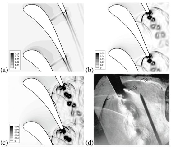 - Sondak, D.L.; Dorney, D.J. Vortex Shedding in a Turbine Cascade. Int. J. Turbo Jet Engines 1999, 16, 107–126. [Google Scholar] [CrossRef]