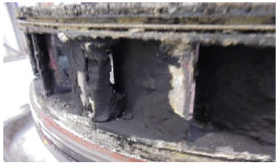 In heavy fuel oil (HFO) operation, the vaned turbocharger nozzle ring might be the first major flow obstruction after the engine cylinder outlets, making it prone to contamination by fuel residuals. The degree of contamination depends on various factors, such as the properties of the HFO, temperature, or the frequency and quality of prescribed turbine washings by end users. A contamination state, as shown in Figure 1, in which some sectors of the nozzle ring are clogged almost completely, is not uncommon. As well as being the cause of a drop in turbine stage efficiency, nozzle-ring fouling is also considered to be the major cause of turbine blade failures due to high-cycle fatigue (HCF).