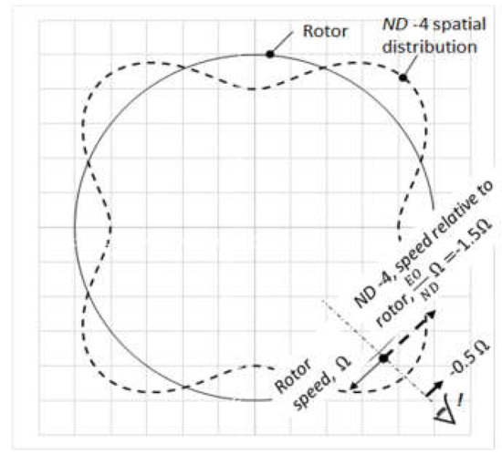 Schematic display of ND spatial distribution and its rotation speed in the case of EO = 6 and ND = −4, the resulting observed engine order from stator will be two.