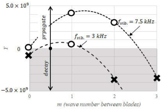 The two curves in Figure 3 are derived by varying only ω (3 or 7.5 kHz), keeping the other parameters in Equation (7) constant. When a blade vibration frequency is 3 kHz, only the modes of m = 1, can propagate downstream but when it is 7.5 kHz, three wave number modes, m = 0, 1 and 2, can.