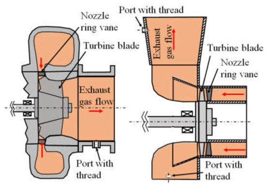 Typical layout of turbocharger turbine stage with instrumentation ports, left: radial turbine; right: axial turbine.