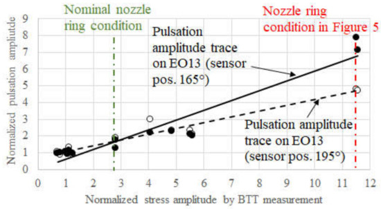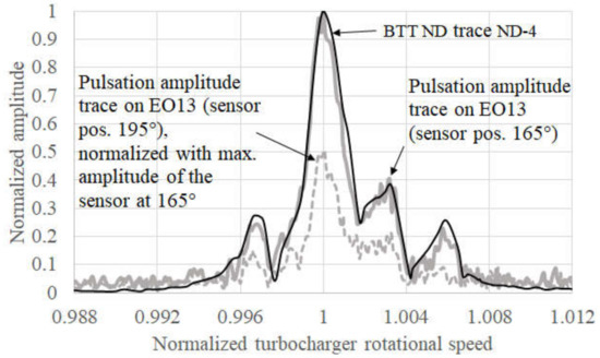 The two pulsation sensors (angular positions 165° and 195°) recorded different pulsation amplitude levels (the amplitude of sensor at 195° is normalized against the maximum amplitude from the sensor at 165°). A closer examination using BTT traveling-wave analysis revealed, however, that such amplitude differences, by a factor of 0.5, can also be found in blade deflection measurements between eight BTT sensors. Therefore, the pulsation amplitude differences shown in Figure 5 relate not to the sensor/measurement chain, but only to the sensor position.