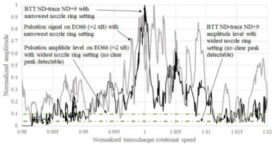 Comparison between BTT ND +9 trace and pulsation amplitude trace on EO66 in a sweep test through a nozzle-ring-vane-induced higher vibration mode along EO24, with narrowest and widest nozzle ring throat configurations (axial turbine stage, B = 33).