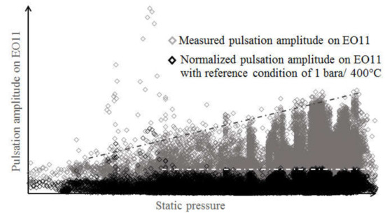 In the high-pressure turbine of a two-stage turbocharging system, the static pressure level in a resonance passage can vary remarkably (in Figure 8, the signal at the right-hand side of the x-axis is about twice that at the origin), and from the measured raw pulsation amplitude, a certain linear dependence on static pressure is visible (refer to the black dotted line for orientation). From Equation (4), the pulsation amplitude radiated by the blade vibration depends on the factor . By defining a reference condition, the measured pulsation amplitude can be normalized, as displayed in Figure 8 (black diamonds). By adopting the normalization, except in some cases, the pulsation amplitude became stable for the entire test period, and not dependent on the static pressure/temperature level.
