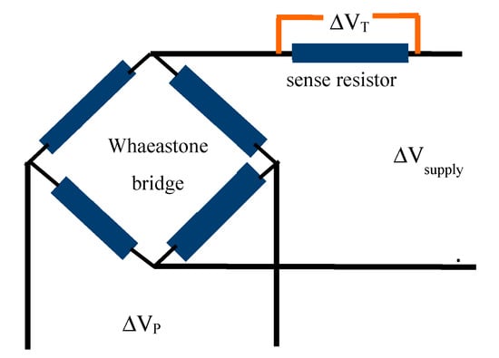 Due to the sensor sensitivity to the temperature, a sensor calibration in pressure and temperature is required before performing the aerodynamic and the dynamic ones. The sensor sensitivity to temperature is measured by applying an additional resistance (“sense resistor” in the following) on the bridge, as showed in Figure 3. The voltage drop across the sense resistor (ΔVT) is mainly a function of the current flowing across the bridge, which depends on the bridge temperature. Thus, by reading the voltage difference across the bridge (ΔVP) and ΔVT, the sensor behavior can be fully documented.