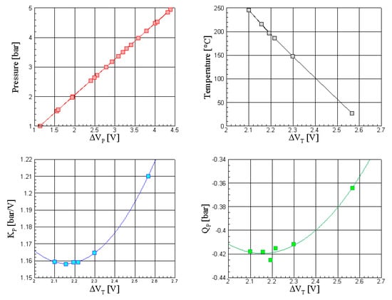 KP,i, QP,i, and UP,i were then fit by polynomial functions (typically linear or parabolic, depending on the trend), to find the KP and QP (as function of the ΔVT). The sensor temperature Ti and ΔVT,i could also be fitted to have KT, QT. Figure 4 shows typical calibration results.