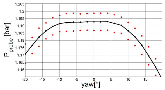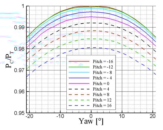 Set B was chosen for this type of probe as it provides both the advantage of keeping separate the two transducer readings and of the proper scaling of the angular sensitivity (PL − PR) to the local kinetic head measured by the probe, at that pitch position. To aid the physical understanding of this latter concept, i.e., of the artificial Pmax, Figure 13 reports the yaw tap pressure measurements (PC) in the yaw calibration range for the different pitch angles. Two observations can be drawn:
