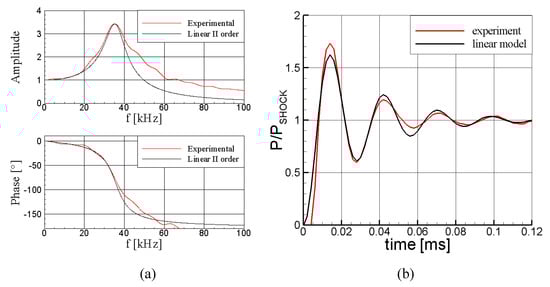 Since the beginning of this research 20 years ago, continuous improvements have been made on the low-pressure shock tube presented in [], in particular on the bursting diaphragm; by using the present-day plastic materials, shock strengths of the order of 0.2–0.3 bars were obtained. They exhibited incomplete opening whose effects were investigated in detail in []; such effects can be properly handled in order to minimize their impact on the determination of the probe transfer function. Figure 7a presents a typical experimental transfer function obtained with the method proposed in []. The experimental trend recalls closely the one of a second-order linear system, with an evident peak at about 35 kHz representing the probe line-cavity system resonance. On the basis of the frequency and amplitude at resonance, the system identification can be done: the corresponding linear system is also plotted in comparison to the experimental one. Differences exist but occur at a high frequency (above 40 kHz). To provide a more intuitive idea of the observed non-linearity, the measured step response and the analytical response are plotted in Figure 7b. The experimental trend reproduces well the one of the analytical model, suggesting that the modelling is reliable for the whole response. The largest difference is concentrated in the first overshoot in which the experiment exhibits a steeper pressure rise and a higher peak. The faster pressure rise at the beginning of the process is clearly responsible for the non-linearity observed in the frequency domain beyond 40 kHz. Since full linearity is not guaranteed a priori, experimental dynamic calibration is crucial to determine the transfer function of each FRAPP manufactured in order to properly compensate the measured signals.