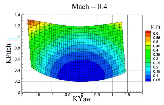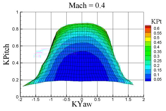 It differs from Set A only by the KPitch that is defined in this set as . This choice allows for a direct link between the central reading of the yaw and the pitch tap, as the central reading for the yaw is, in any case, dependent on the pitch flow angle. This set, although seemingly smart, in fact, connects the two sensors readings and, in case of a thermal drift, it may increase substantially the final uncertainty. From a purely aerodynamic point of view, as shown in Figure 12, it changes the KPitch coefficient magnitude but does not fix the overlap at the grid boundary.
