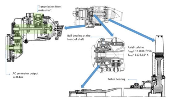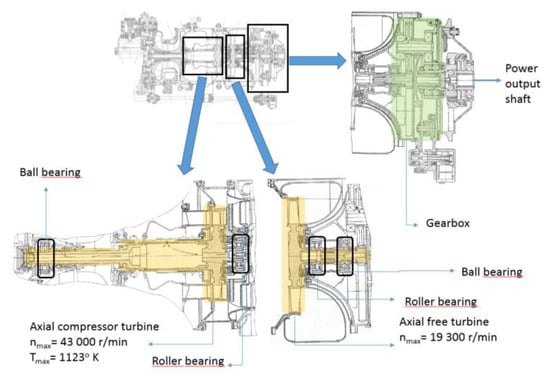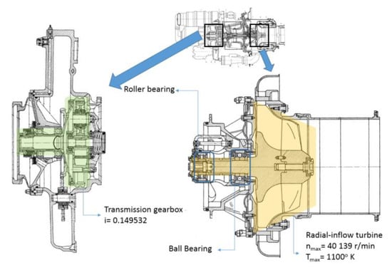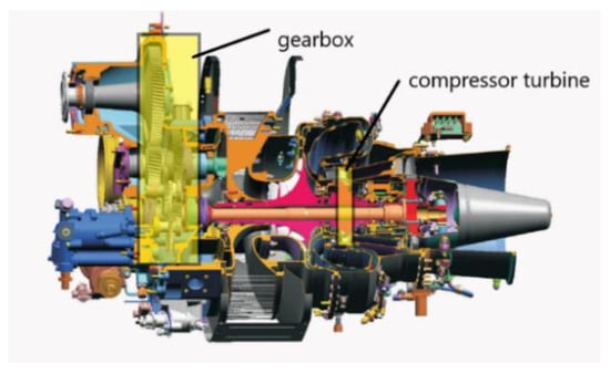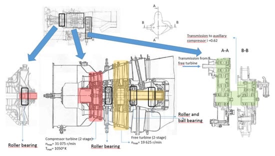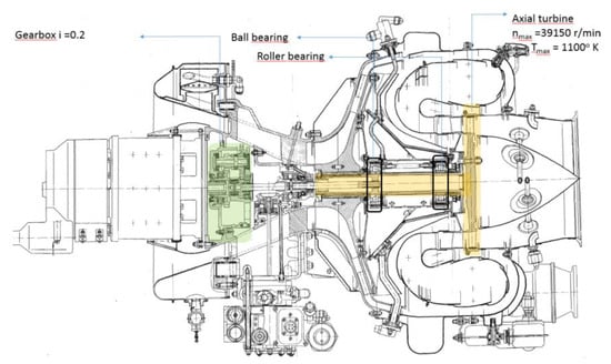 The VSU-10 is a two-shaft engine with a 2-stage axial compressor turbine and a 2-stage axial free turbine []. The maximal TIT for the compressor turbine is 1050 K, with a maximal RPM of 31,975 r/min. The free turbine has a maximal RPM of 19,625 r/min and it drives an auxiliary compressor via the gearbox, with a reduction gear ratio of 0.62. The maximal mass airflow for this engine is 3.9 kg/s. The cross-section of this engine is shown in Figure 6. The compressor turbine has a roller bearing on either side, while the free turbine has a roller and ball bearing on one side.