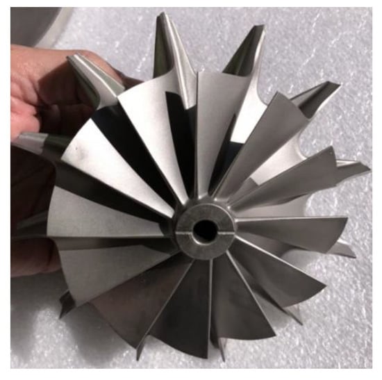 The model T-62T [] is another engine that was widely used in military helicopters. It is a single-shaft engine with a maximal RPM of 61,565 r/min and a maximal TIT of 1000 K; the engine’s Nmax is rated at 44.1 kW. This engine is equipped with a radial inflow turbine, as shown in Figure 9.