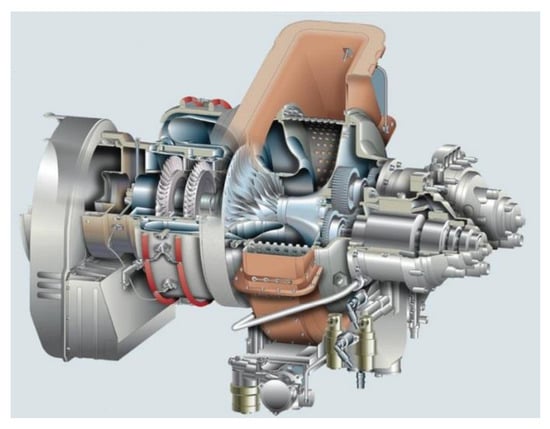 Another option is the single-shaft TA12-60 unit, which has a three-stage axial turbine with a maximal RPM of 24,470 r/min and a TIT of 1115 K []. The maximal mass airflow is 2.1 kg/s, with a Nmax of 60 kW. However, it was not possible to obtain a cross-section image of this engine.