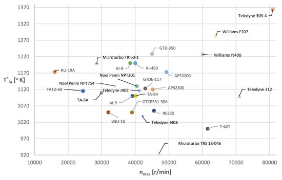 Comparison of the TIT (T*in) and nmax of small turbojet and turboshaft engines.