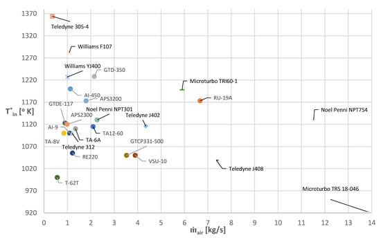 Additionally, the small turboshaft engines TA12-60, TA-6A, TA-8V, AI-8, AI-9, AI-450, GTDE-117, APS2300, APS3200, and GTD-350 have a maximal TIT equal or greater than 1100 K and a high maximal RPM. Due to the lower TIT of the turbine wheels from the VSU-10, RE220, T-62T, and GTCP331-500 engines, they cannot be considered for the TC unit. Additionally, due to the low maximal RPM value of the RU-19A engine (16,000 r/min), such an engine cannot be considered for the TC unit. Small turboshaft engines are equipped with a power output shaft and a reduction gearbox, which makes it easier to adapt them for use in a TC unit. Figure 14 shows a comparison of the maximal TIT (Tin) and the maximal ṁair of small turbojet and turboshaft engines.