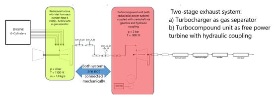 In the literature [], the available energy of the waste heat from a 6-cylinder HDD engine was analyzed. This engine was equipped with a high- and low-pressure loop exhaust gas recirculation (EGR) system. The authors compared three types of waste heat recovery systems, while 1-stage and 2-stage turbocharging systems were compared against a turbocharging system using the Rankine combined cycle (RCC). At full-load, the 1-stage turbocharging system provided 40.0 ÷ 74.8 kW of available energy from the waste heat, whereas the 2-stage turbocharging system provided 43.0 ÷ 76.3 kW of available energy. At low-load conditions, the available energy was small compared to high-load conditions. It was also found that turbocharging with the RCC improved the brake-specific fuel consumption (BSFC) by about 3%.