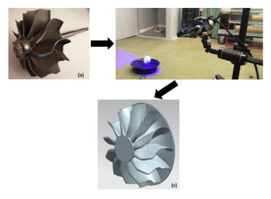 It was possible to obtain a K44 automotive turbocharger turbine. This turbine is shown in Figure 17, along with the scanning process and turbine model generated in the Unigraphics NX software.