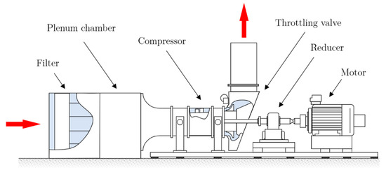 The experimental work presented in this paper has been realized on the single stage low pressure axial compressor CME2, composed of a 30-blades rotor and a 40-vanes stator. An overview of the test rig is proposed in Figure 1, and the main characteristics of the compressor are listed in Table 1. In this study, the compressor has been operated at a fixed rotational speed of 3200 r/min. At this speed the nominal flow rate is 5.3 kg·s−1.