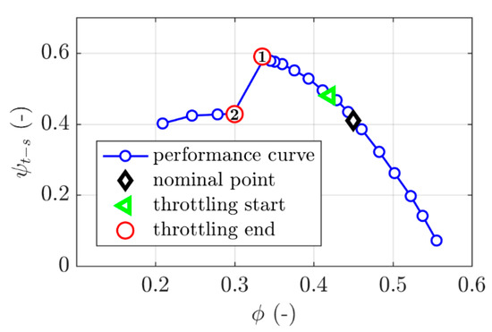 - The first one corresponds to a complete throttling. For this procedure, the mass flow rate is decreased continuously until the rotating stall appears (red circle “2”). Three rates of decrease have been investigated, respectively equal to 0.30, 0.17, and 0.06 kg·s−2, and labelled fast, moderate and slow throttling speed in the following. The decrease rate of the mass flow rate is depicted in a previous article (see [17]). In this case, the rotating stall onset is forced;