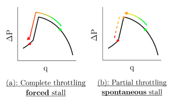 - The second one corresponds to partial throttling. In this case, the process is stopped just before the onset of the rotating stall, at the last stable operating point (red circle “1”), by a mechanical stop. The compressor continues to operate until it enters stall, or not. In this procedure, the rotating stall is spontaneous.