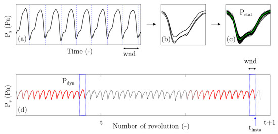 In these expressions, P(t + i) refers to the instantaneous blade passage pressure signal, Pref(i) to the reference pressure profile, wnd being the size of the temporal window used to perform the computation, which is the duration between two subsequent blade passages in this study.