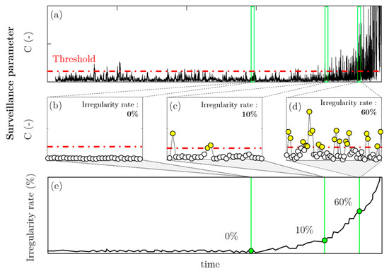 Schematic representation of the evolution of the surveillance parameter and the warning parameter for a given surveillance threshold. (a) Surveillance parameter evolution during a test; (b–d) zoomed views; (e) irregularity rate evolution.