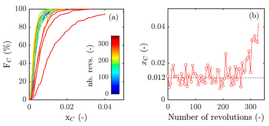 On this plot, each function represents the distribution of each correlation value xc, as a percentage of the total number of values over the period (here equal to 5 revolutions × 30 pitches = 150). In this figure, the shape of the cumulative distributions changes as the compressor is pushed toward stall. Up to 250 revolutions, where the compressor still operates in the stable region, all the distributions exhibit similar shapes. One observes in particular that the maximum values of the distribution (i.e., Fc = 100%) are very close. The evolution of the value under which falls 100% of the instantaneous correlation is plotted in Figure 7b. By taking the mean value during stable operation (up to 250 revolutions), one can easily obtain the value of the surveillance parameter for which, on average, 100% of the profiles are considered healthy. Then, this value can be used to set up the threshold to discriminate normal profiles from perturbed ones. In the case presented in Figure 7b, this threshold will be fixed to 0.012. This value is automatically adjusted for each test, surveillance parameter and sensor location.