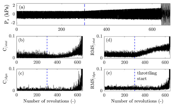 The choice of the reference pressure profile does not affect both surveillance parameters equally. During the throttling process, two different phenomena can affect the general shape of all the pressure profiles: (i) when the operating point approaches the stability limit, the amplitude of the pressure fluctuations increases (Figure 8a); and (ii) some unsteady phenomena (vortical structures, boundary layer separation) can affect a limited number of profiles. The warning procedure described in the previous section aims to catch the occurrence of the second type of profile modification, as they are the trace of phenomena that can trigger the transition to rotating stall. Since the RMS computes the direct difference between both signals, when used with the reference profile Pstat its values show an increase as soon as the throttling process starts, as depicted in Figure 8d. In this case, the surveillance parameter increase mainly reflects the modification of the amplitude of the instantaneous profile. The Correlation exhibits the same behavior, to a smaller extent, as shown in Figure 8b. Indeed, this parameter is normalized by the autocorrelation of each signal, and computes a difference in the shape of the signals, which exhibits not as many changes when the amplitude increases.
