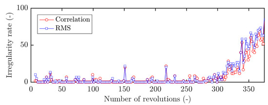 Irregularity rate evolution computed from the Correlation and the RMS (surveillance threshold respectively equal to 0.012 and 0.021). Sensor location: (x,θ) = (−0.06.Cx, 90°); moderate throttling speed.
