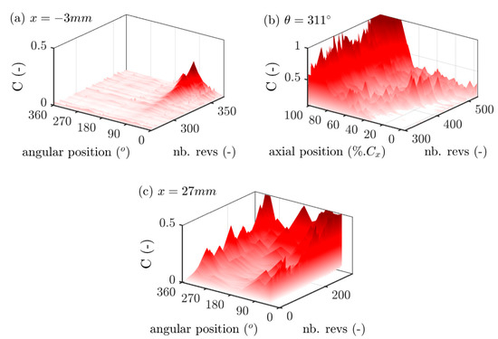 To do so, the evolution of the Correlation has been analyzed over 20 angular locations (presented in Figure 3a) (covering the whole circumference) for x = −0.06Cx, 14 axial positions (ranging from the leading edge to the trailing edge of the rotor) for θ = 311°, and five angular positions for x = 0.55Cx (Figure 3b). The results have been gathered on Figure 11.