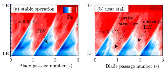 In Figure 11b, we can see, firstly, that the further downstream a transducer is from the leading edge, the greater the degradation of the warning parameter is, and the sooner it appears. When the operating point moves closer to the stability limit, several phenomena occur. The low-pressure zone attached to the suction side shrinks in the axial direction. This behavior is clearly visible on Figure 13. In this figure, two pressure contours, extracted at a stable operating point (a) and near the stability limit (b), are presented. The sensors’ locations, depicted in Figure 3c, can be seen on the y-axis of Figure 13a. One can see that the size of the low-pressure zone decreases from 61% of the axial chord to 40%, in the axial direction. A second behavior is also visible on this figure where the Tip Leakage Vortex (TLV) can only be easily distinguished from the stable operating points (Figure 13a). When the operating point approaches the stability limit, the TLV decreases in size and becomes highly unsteady. The apparition of vortical structures is also visible close to the leading edge. All these phenomena explain why the degradation of the Correlation is earlier for downstream positions. However, for positions further than x = 0.5Cx, the Correlation does not exhibit noticeable degradation over time. Indeed, the events detected by the Correlation (low-pressure zone shrinkage, TLV destabilization, radial vortices, etc.) are localized in the first half of the chord. In addition to this lack of features to detect, the pressure signals are more perturbed and do not allow a reliable detection.