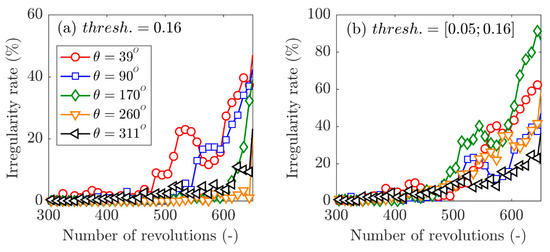 Thus, axial locations in the first half of the channel are more suitable than locations upstream of the leading-edge. Even for the non-axisymmetric tip gap, there will be an axial location where the surveillance parameter will display a degradation. To overcome the non-even distribution of correlation degradation, it is however necessary to adapt the threshold value depending on the sensor angular position. This can be realized thanks to the automatic optimization procedure presented earlier, and an example is presented in Figure 14. In Figure 14a, the same threshold is applied whatever the sensor location, and as expected, the irregularity rate starts increasing at different moments, ranging from t = tstall—200 revolutions to t = tstall—0 revolutions. In Figure 14b, however, the threshold is changed from one sensor to the other, which leads to almost simultaneous degradation of the irregularity rate. It can also be noted that the slope of the irregularity rate is different depending on the angular position. Indeed, the procedure proposed here only allows one to consider the perturbed profile sooner by analyzing the “normal” level of perturbation under stable operating conditions, and therefore only impacts the irregularity rate degradation at the beginning. However, the quantity of irregularity creations during the throttling remains circumscribed to the local flow and tip gap, thus explaining the difference in slope.
