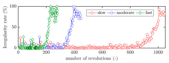 Evolution of the irregularity rate for three different throttling speeds.