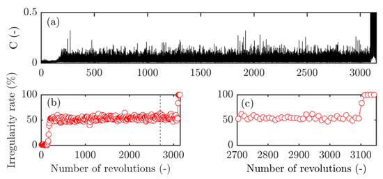 Figure 17 presents the evolution of the surveillance parameter and the associated irregularity rate, during a partial throttling procedure in a representative test. The end of the throttling procedure is reached around t = 200 revolutions, and after this point, the compressor continues working properly during almost 3000 revolutions. [It should be noted that this duration is totally random from one test to the other, ranging from a few hundred (i.e., a few seconds) to several thousand revolutions (i.e., a few minutes).] Whether thousands of revolutions (Figure 17b) before stall or just a few (Figure 17c), the irregularity rate shows no evolution of any kind, and remains around 50%. This lack of evolution of the irregularity rate at this last stability point indicates an absence of noticeable degradation of the flow in the tip region.