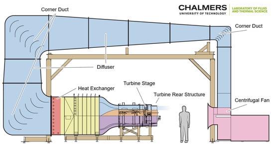 - Rojo, B.; Kristmundsson, D.; Chernoray, V.; Arroyo, C.; Larsson, J. Facility for investigating the flow in a low pressure turbine exit structure. In Proceedings of the European Turbomachinery Conference, Madrid, Spain, 23–27 March 2015. [Google Scholar]