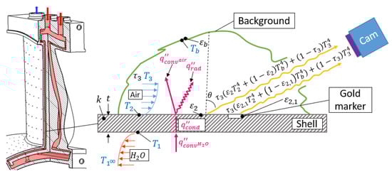 Figure 3 shows the one-dimensional simplification of the OGV wall and measurement implementation with the heat flux going from the warm water channel to the cold air stream through the shell. The warm waterside has the subindex 1, the surface of the OGV has the subindex 2 and the air has the subindex 3. The background temperature and emissivity are indexed with b. The desired quantity is the convective heat transfer on the surface . This is calculated by subtracting the conductive heat flux with the radiative heat flux . The is measured by the wall temperature difference over the shell. The radiative heat flux is described by and is arguably the most challenging quantity to measure, as further discussed in this work. The effects of the transmissivity air are compensated for via the in-situ calibration later described in Section 4.5.