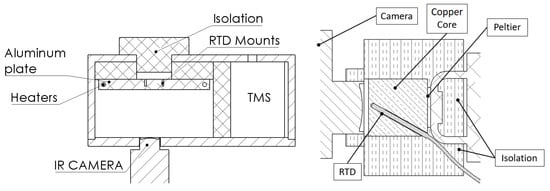 To calculate the function and the polynomial P, two calibrators were built, with the schematics of both shown in Figure 5. The first calibrator consists of a well-isolated enclosure with optical access to a 30-mm thick flat aluminium plate coated with Nextel coating. The second is a well isolated Nextel coated 50 mm diameter copper cylinder with a door to keep the cylinder at a uniform temperature when not in use. The first device was used to construct the calibration. The second device was used for intermediate controls of the camera calibration while working with the camera. The temperature of both calibrator metal cores is measured by RTDs. In the aluminium plate three RTDs, two in the centre and one near the outer edge, were used while in the copper only one in the centre was used. The temperature management system (TMS) controls the core temperature and triggers the camera when stable temperature conditions are reached. When triggered, the camera captures 1000 frames and the calibration is obtained for every camera lens and focal settings. The properties of the surface coating are captured in the in-house calibration as both calibrator and test geometry are coated with the same coating.