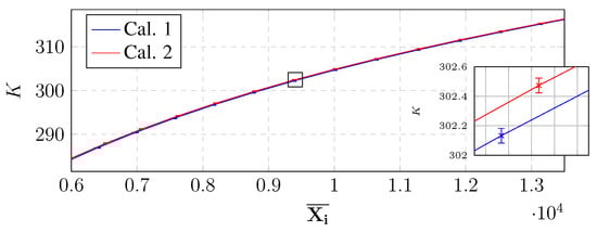The effects of ambient temperature, focal changes, or camera background on the in-house calibration were evaluated by cross-checking camera performance several calibrations and the two calibrators. Changes such as different camera orientation, optical focus, and temperatures expected during the experiment were tested. Temperature changes to optics could lead to a near-uniform average offset of 1 K while changing focus could lead to a non-uniform offset of 0.3 K. This offset arises from the change of radiation from internals of the optics as well as narcissus effects [14] when the focus was changed. Variation due to camera orientation or background radiation was not detectable. Two repeated calibrations with different optical focus settings are shown in Figure 6, where the error bars show the maximum deviation from mean within the measurement point.